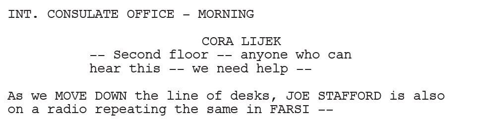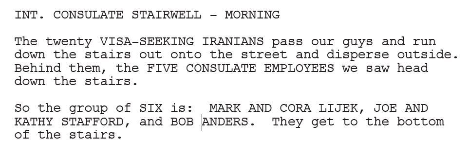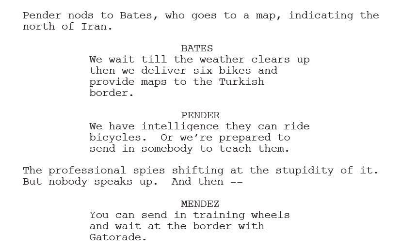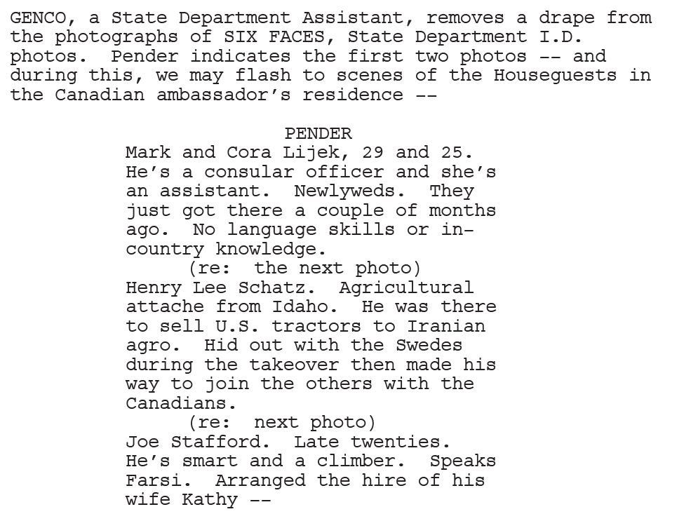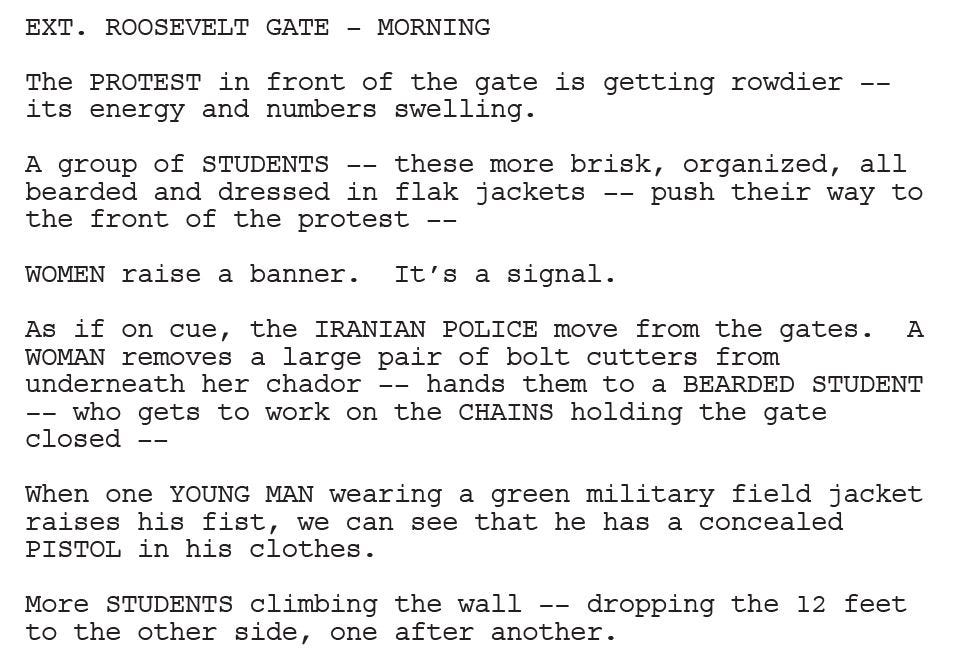 If Terrio has a writing style, it’s that he is economical with his lines— for instance, instead of repeating dialogue where a character says something in a different language, he indicates that it’s said in Farsi…