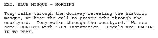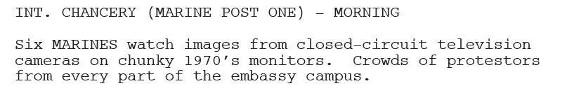 Additionally, Terrio uses a lot of double hyphens ‘- -’ to either indicate a new shot or breaking paragraphs to create urgency.