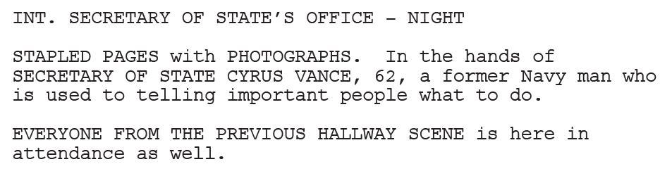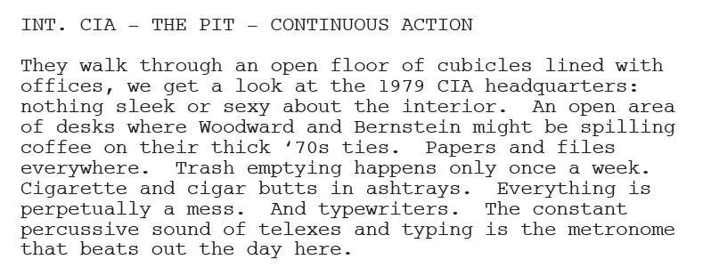 Terrio doesn’t waste a lot of time describing his characters beyond their age, and, if required, their ethnicity. But I like how he describes Mendez through his clothes, showing us that his work consumes his life so much that he doesn’t even have time to sleep properly (and later, we get the hints that his work-life has strained his personal life). This is a great example of show, don’t tell.