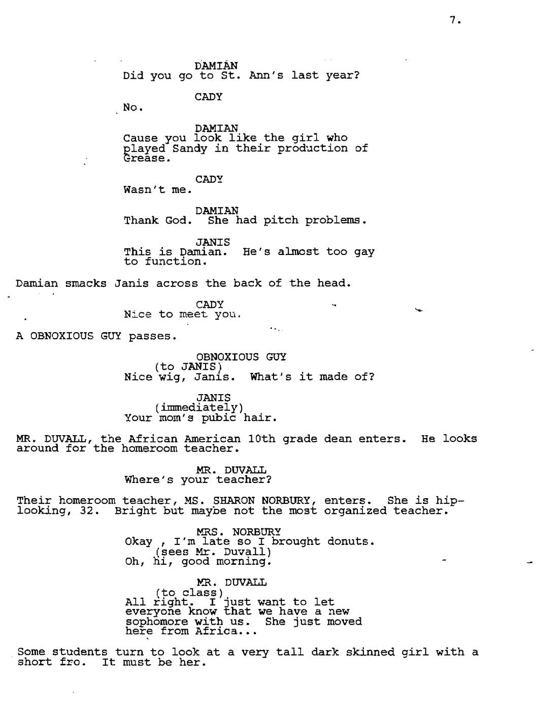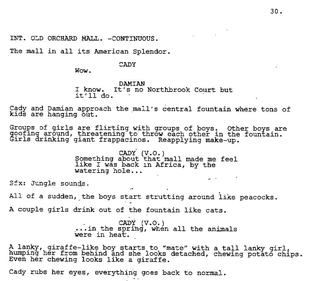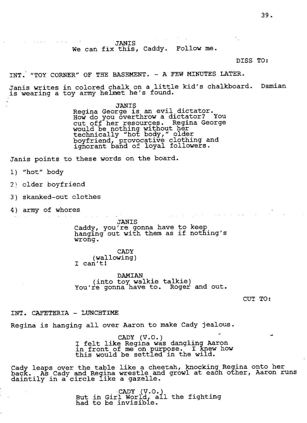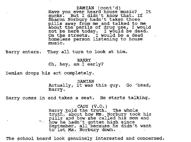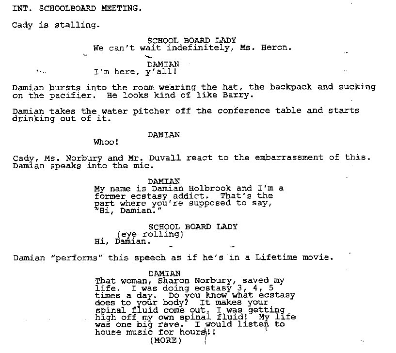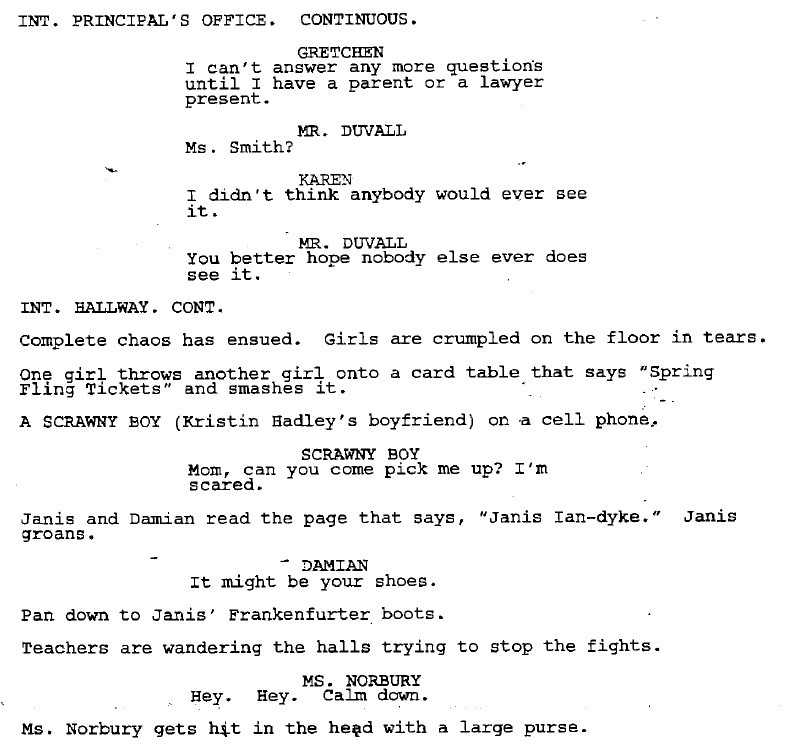 Amid all this, there is a sub-plot about how Cady’s actions directly impact one teacher, Ms Sharon Norbury, when she accidentally witnesses the teacher confiscates drugs from a student and unintentionally makes it seem like Ms Norbury does drugs. In fact, this sub-plot gets omitted in the final film as in this script draft, the climax becomes a school board meeting in which Cady helps to get Ms Norbury reinstated; in the film, it’s changed to the Mathletes contest.