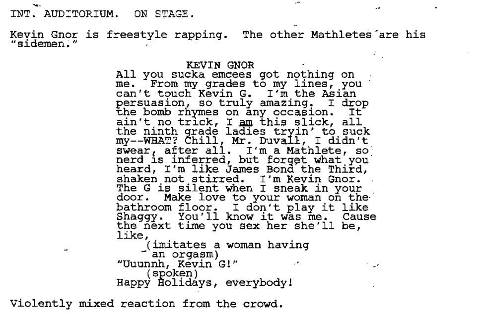 Another difference is that fan-favorite character, Kevin G., doesn’t get a lot of attention in this draft as he would in the film. There’s also more swearing.