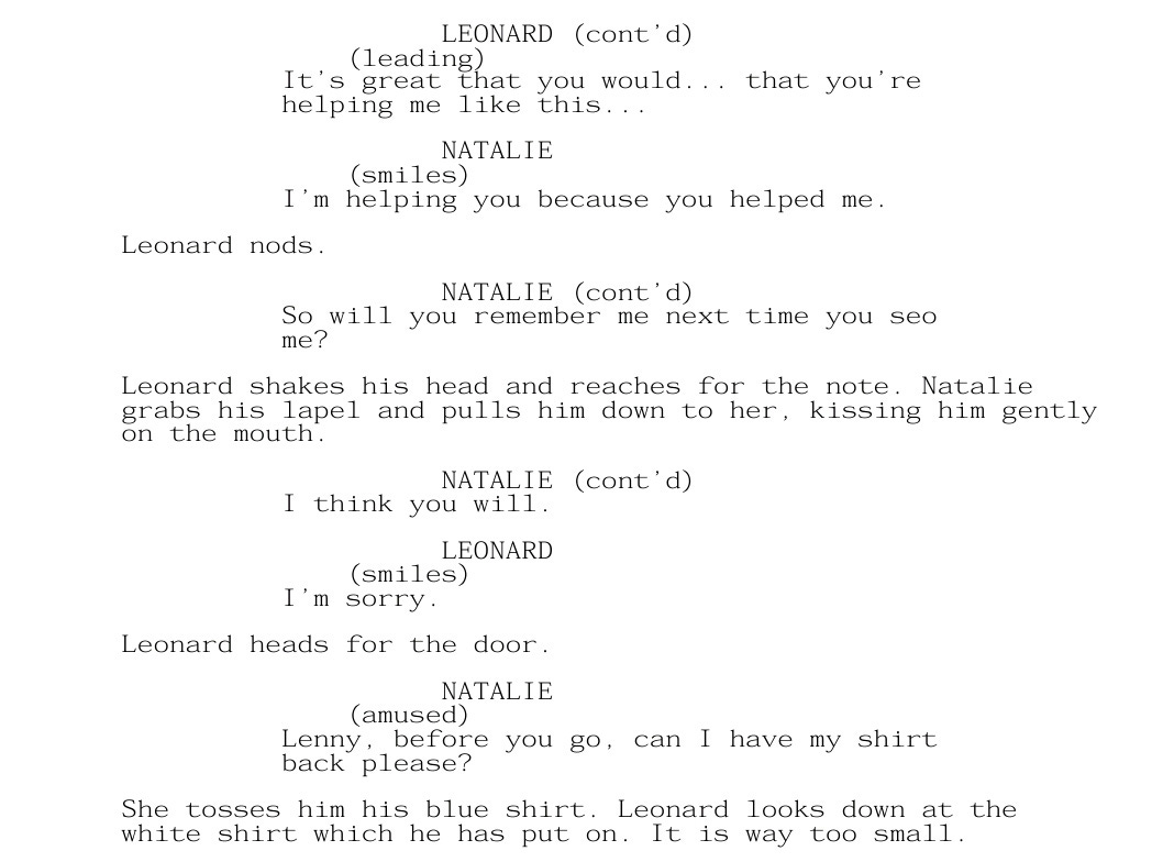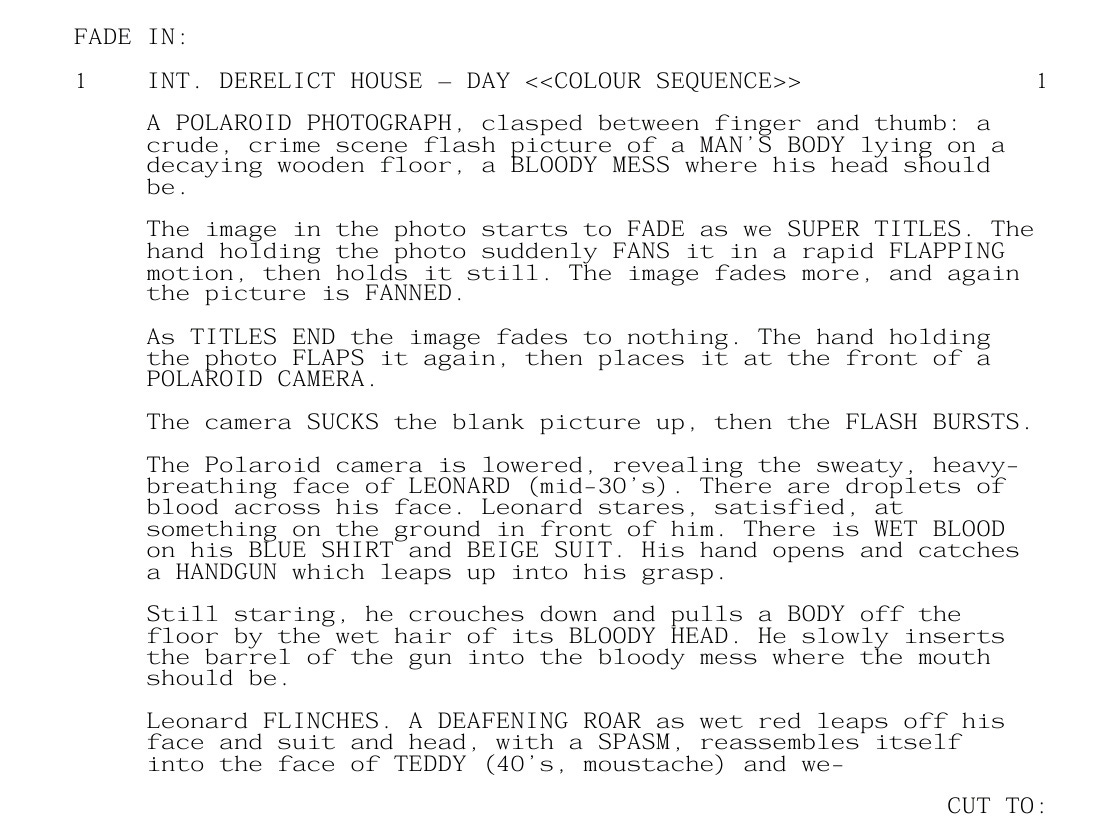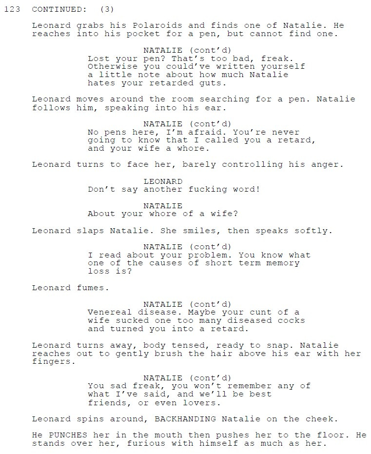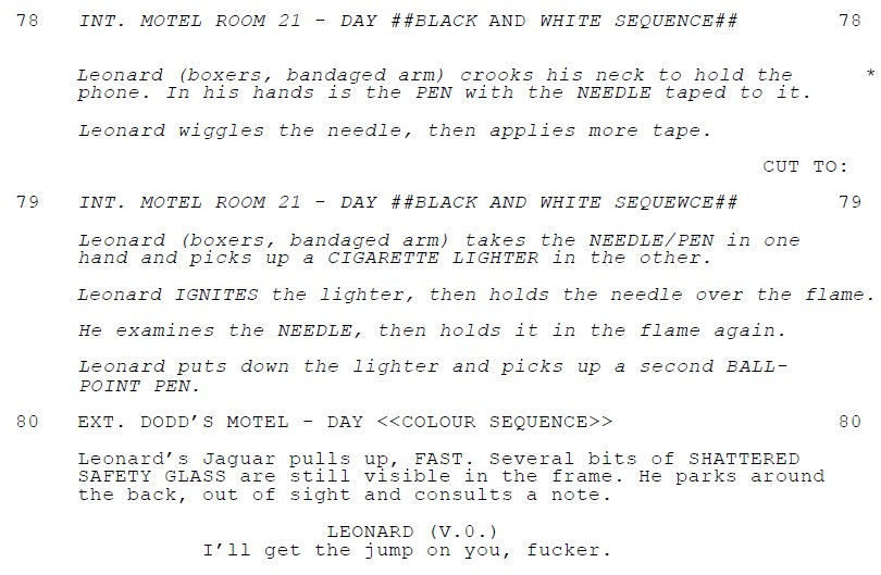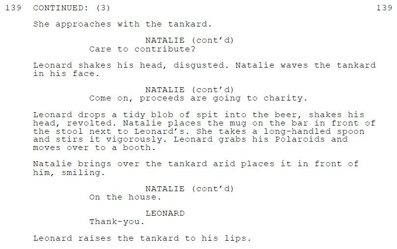 The short story, ‘Memento Mori’, (which is included in the screenplay) is different to what the elder Nolan would end up writing. Not just in characters but in situation, too. For the screenplay, Nolan was particularly interested in exploring how Leonard’s condition would make it easy for people to use him. This is demonstrated vividly in Scene 139— no words needed to explain how cruel it is.