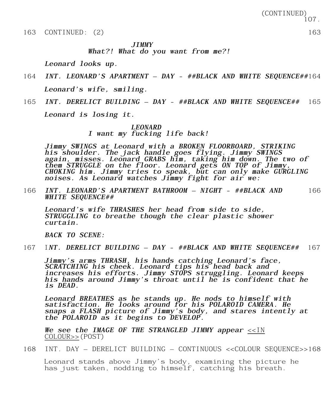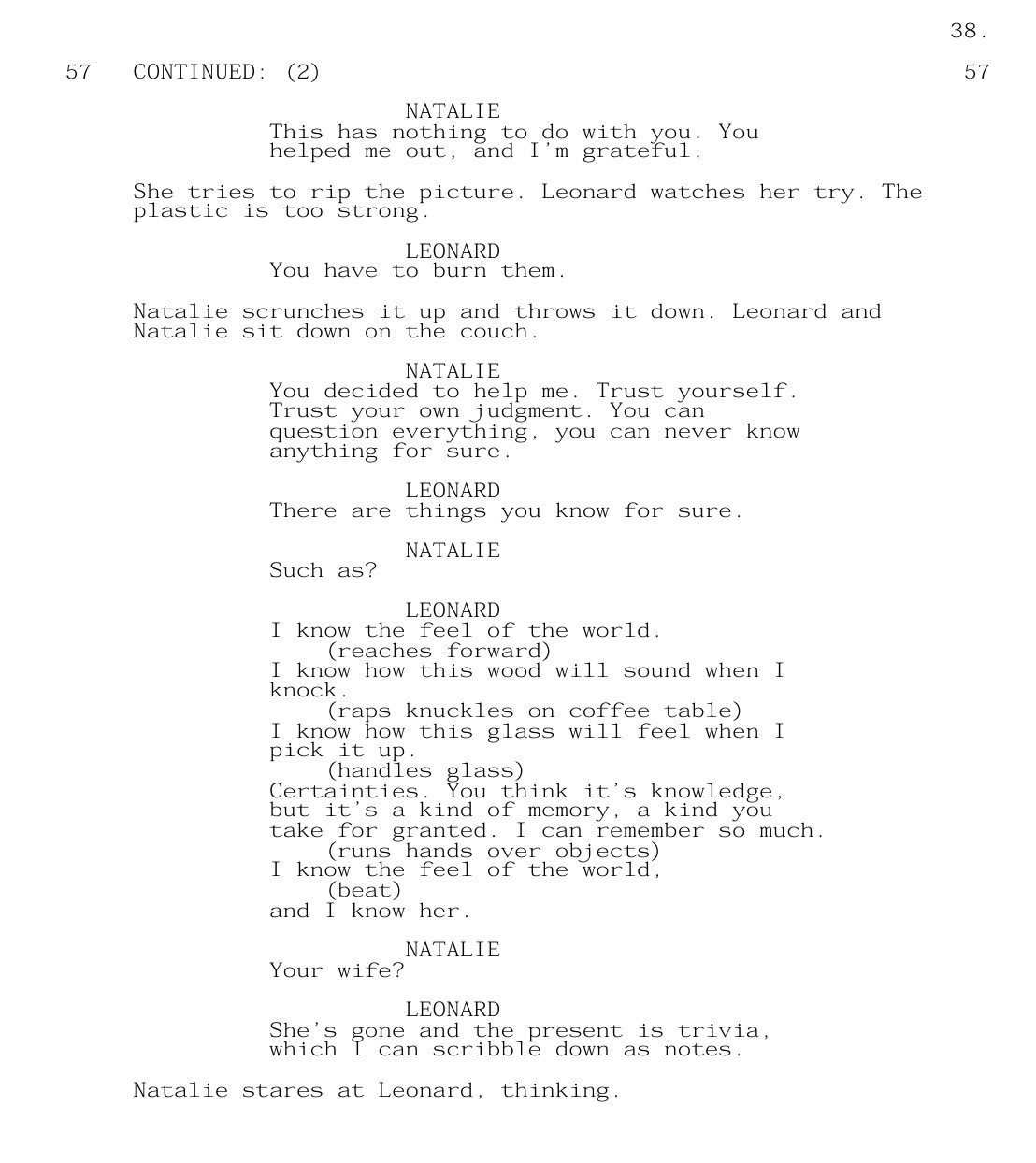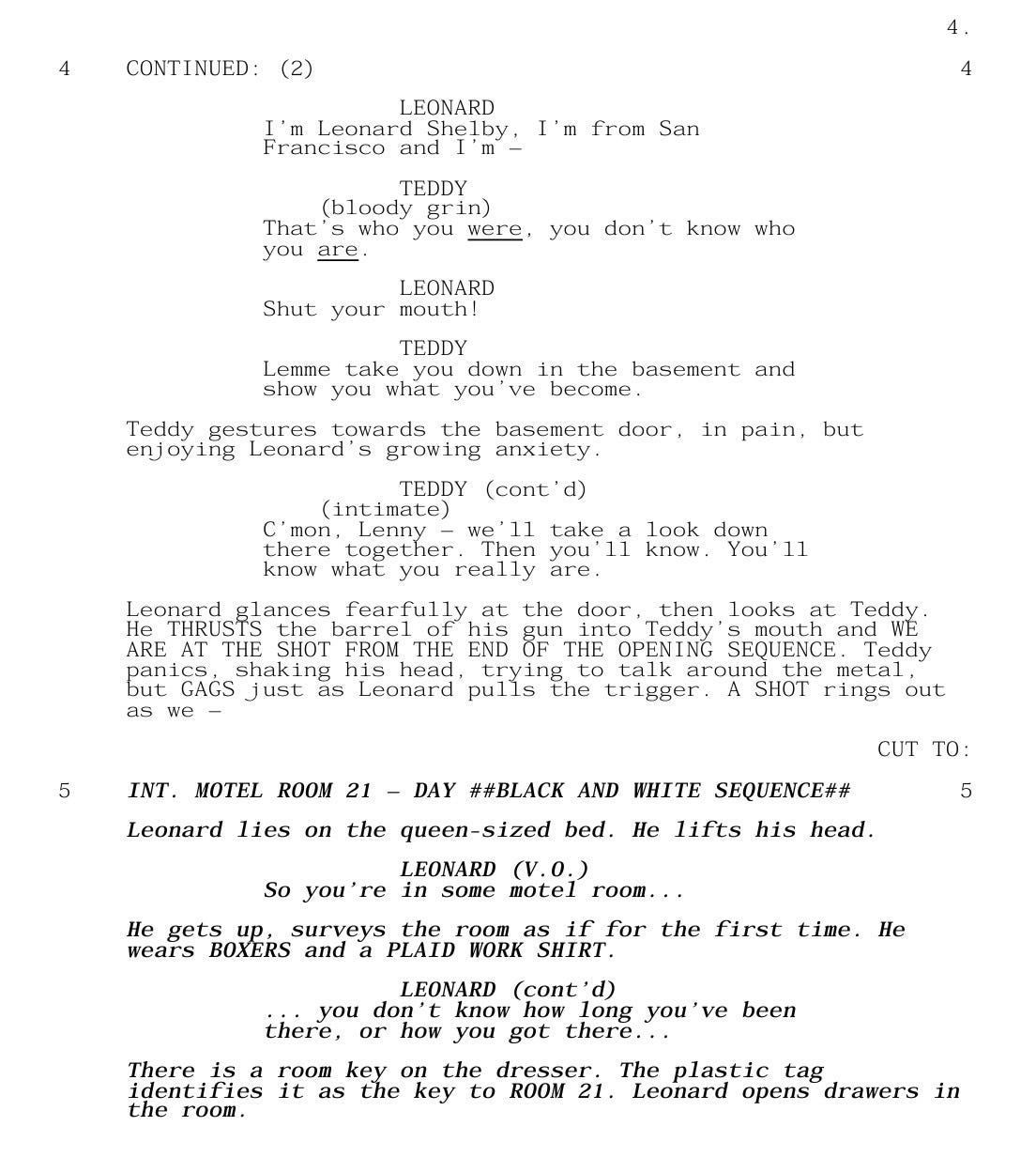 The short story, ‘Memento Mori’, (which is included in the screenplay) is different to what the elder Nolan would end up writing. Not just in characters but in situation, too. For the screenplay, Nolan was particularly interested in exploring how Leonard’s condition would make it easy for people to use him. This is demonstrated vividly in Scene 139— no words needed to explain how cruel it is.
