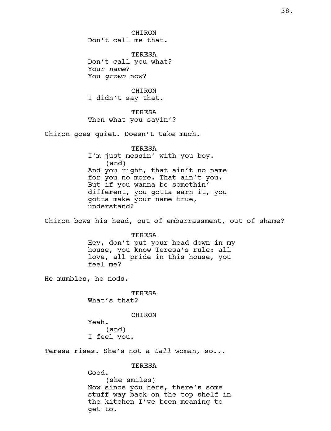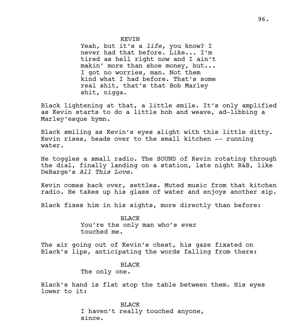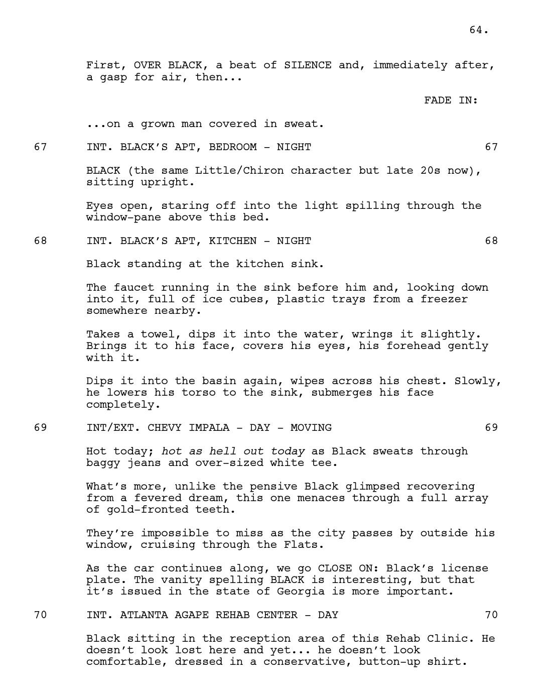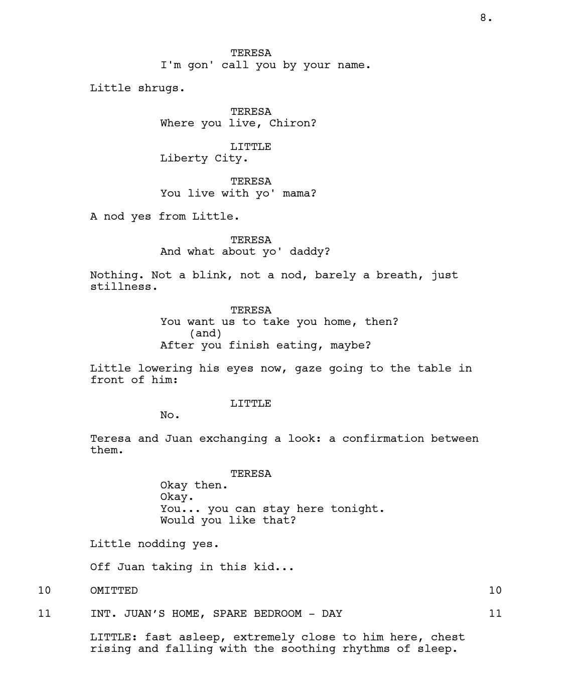 Romanski liked it, too. She sent Jenkins to Brussels for one month (the location was picked on a whim) to work on a draft. Most of the material already existed in the unproduced play’s 45 pages; for Jenkins, it was more about “extending and filling in some of the blanks.” He also brought in some of his own memories— the scene of Little boiling water to soak in the bathtub (Scene 28, page 24) was something that Jenkins used to do. Rather than outlining each beat, he used waypoints as reference to get to where he wanted.