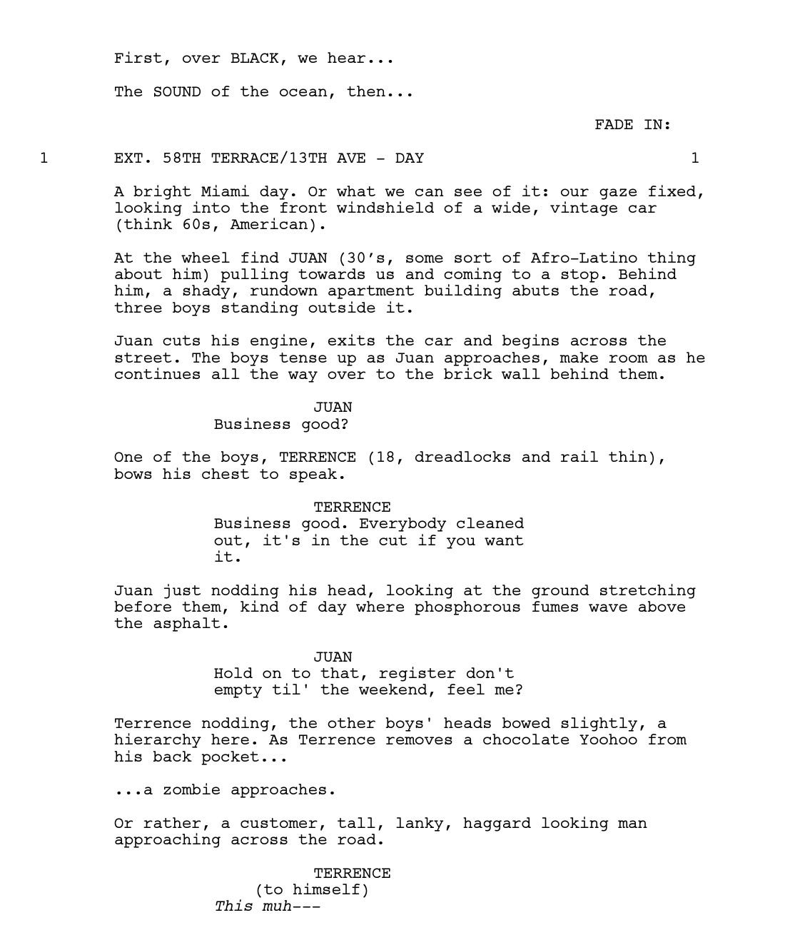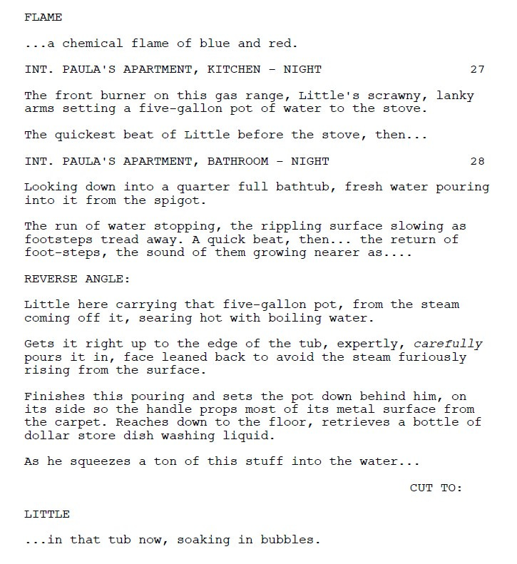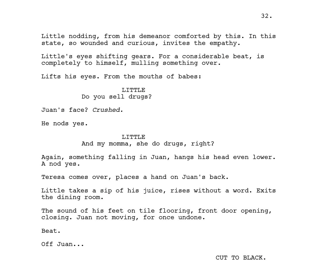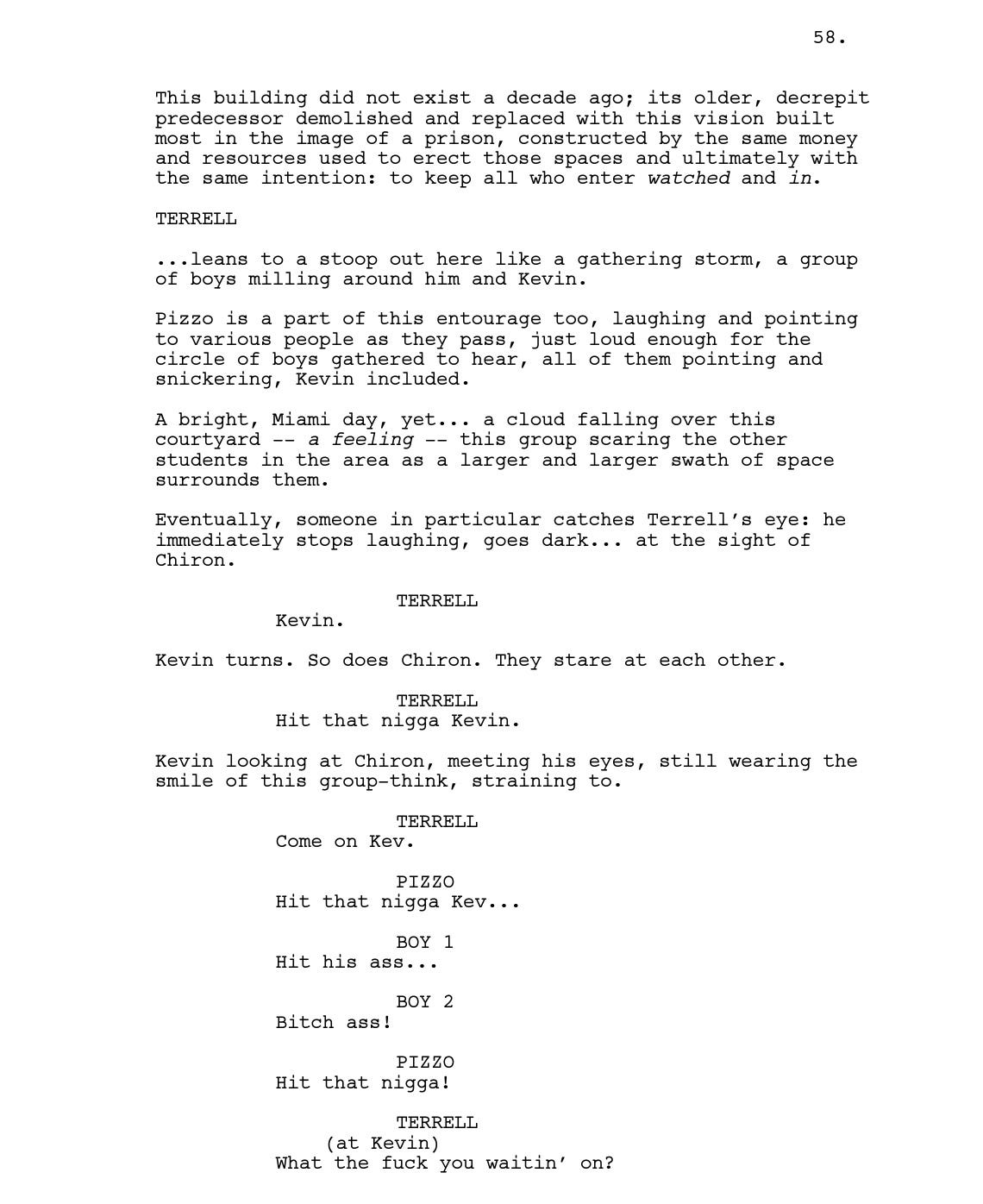Romanski liked it, too. She sent Jenkins to Brussels for one month (the location was picked on a whim) to work on a draft. Most of the material already existed in the unproduced play’s 45 pages; for Jenkins, it was more about “extending and filling in some of the blanks.” He also brought in some of his own memories— the scene of Little boiling water to soak in the bathtub (Scene 28, page 24) was something that Jenkins used to do. Rather than outlining each beat, he used waypoints as reference to get to where he wanted.