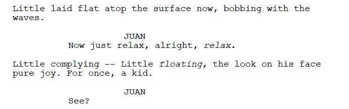Simply speaks to his prowess as a writer. I also like how he indicates when characters have a new though by breaking the dialogue into separate lines instead of using ‘beat’ or parentheses to break it up, creating a nice flow that makes it easy to read.