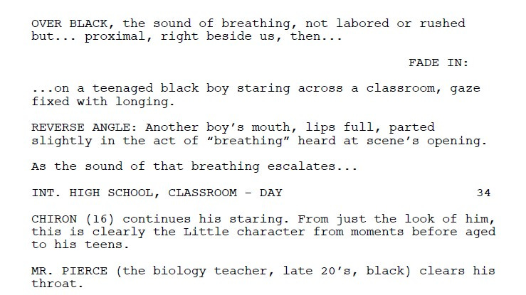 In a compact 98 pages and across 99 scenes, the Moonlight screenplay is a triptych portrait of a young African-American man struggling with his identity and sexuality at three different stages in his life— as a child, as an adolescent, as a young man. Each Act corresponds to a new stage in his life; in each Act, he’s referred to by a different name. As a 12-year-old boy, he’s referred to as Little in Act 1; as a 16-year-old teenager, he’s referred to as Chiron (his real name); as an adult in his late 20s, he goes by the name of Black. To avoid confusion, when I refer to him by one of the three names, it is connected to the stage in his life that the events are taking place in.