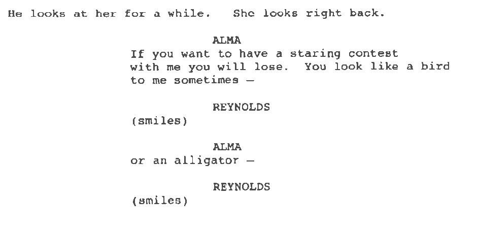 This is helpful if you want to write a screenplay about a world you aren’t too familiar with, or has a lot of technical jargon that adds verisimilitude but could detract from the emotional story. Simply provide a general indication of what needs to be said, and keep your eye on the story and emotion.