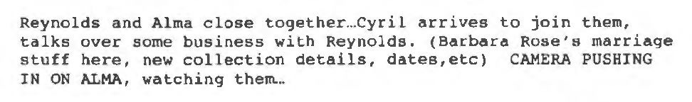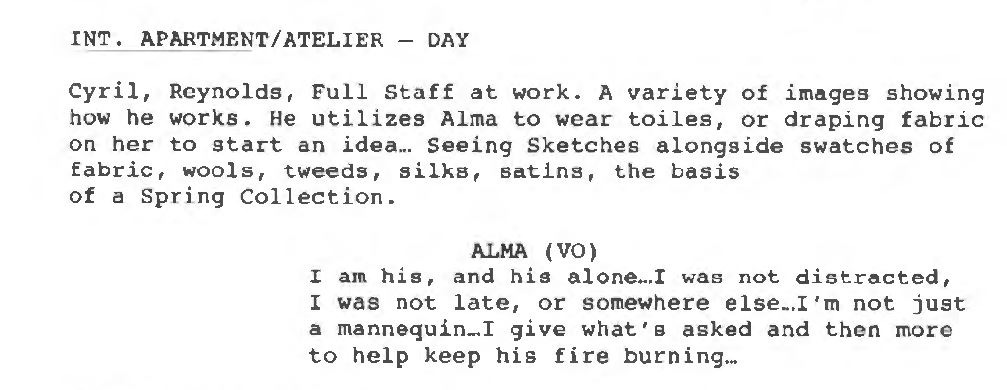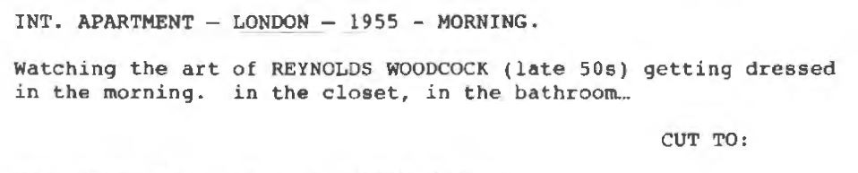 Another reason the screenplay runs so short in pages is because PTA doesn’t elaborate on the sequences in a montage as he might have in previous scripts. Reynolds has an elaborate process of getting dressed that includes brushing his shoes and what not. If PTA went to outline every step, it would take up some space. Instead, this is how he writes it: