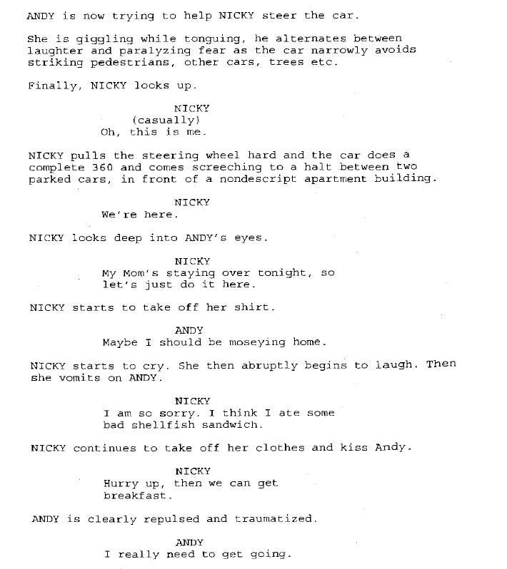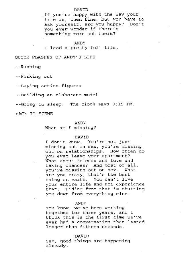 How does The 40-Year-Old Virgin fit in today’s context? Does it still work? The acceptance of asexuals today is small but growing, and there’s an argument to be made that Andy could be asexual. The technical definition of an asexual is “the lack of sexual attraction to others, or a low interest in sexual activity” (please note that asexuality is not equal to celibacy). On page 16, he argues that “there’s more to life than sex” but David makes an equally compelling argument that Andy isn’t just missing out on sex, but the messiness that comes with being with people. I’d be intrigued to read a version of this script where Andy IS asexual and struggles to reveal this to Trish even though he is in love with. Would it work out?